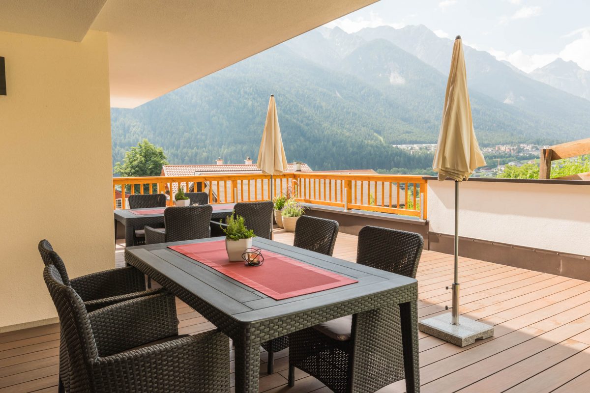 • Southwest oriented terrace with green area and a view oft he impressive surrounding mountain scenery
